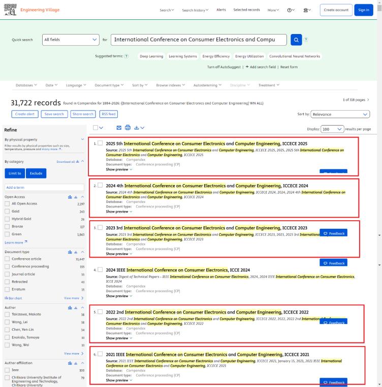 【會(huì)議歷史】(往屆均見(jiàn)刊檢索)ICCECE會(huì)議從2021年起歷屆都成功舉辦,參會(huì)者就消費(fèi)電子、計(jì)算機(jī)工程等領(lǐng)域的最新研究和理論在會(huì)上進(jìn)行交流和分享。目前,歷年會(huì)議的文章均已完成出版,并被EI和SCOPUS檢索。
