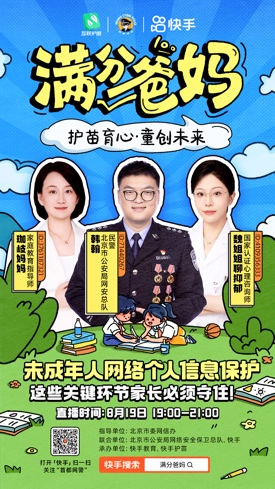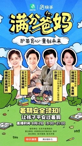 在北京市委網(wǎng)信辦指導下,快手聯(lián)合共青團北京市委員會、北京市高級人民法院、北京市人民檢察院、北京市婦女聯(lián)合會、北京市公安局網(wǎng)絡安全保衛(wèi)總隊,共同開展11場未成年人保護主題直播,由法官、檢察官、網(wǎng)警、專家學者,連麥快手教育、心理領域創(chuàng)作者,陪家長和孩子一起度過踏實又暖心的夏天。