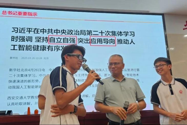 他特別強調(diào),人工智能不僅是國家戰(zhàn)略的重要組成,更是青少年面向未來必須掌握的核心素養(yǎng)。講座中,藍云教授援引2025年中共中央政治局就人工智能發(fā)展與監(jiān)管進行的第二十次集體學習內(nèi)容,突出傳達了習近平總書記提出的“堅持自立自強,突出應用導向”等重要指示,為整場講座注入了鮮明的時代性與政策高度。