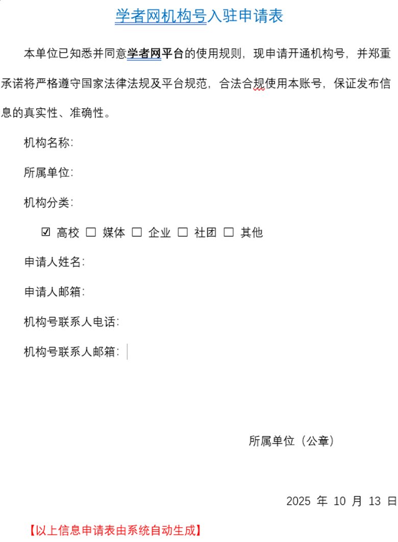 以往機構(gòu)號申請過程中,申請者常因提交材料格式不統(tǒng)一或內(nèi)容不符合要求而被駁回,影響入駐進度。針對這一問題,新版機構(gòu)號推出了 “申請表模板生成”功能。申請人只需在線填寫基礎(chǔ)信息,系統(tǒng)即可自動生成規(guī)范的申請表。下載、蓋章并上傳后即可完成提交,既節(jié)省時間,又顯著提升了申請成功率。