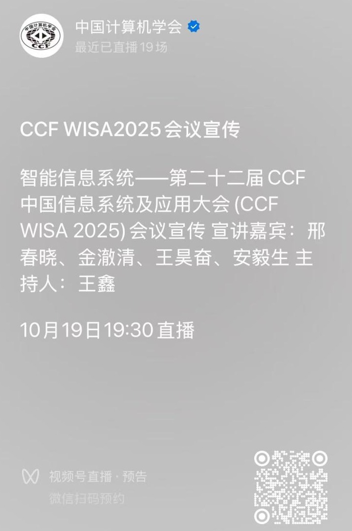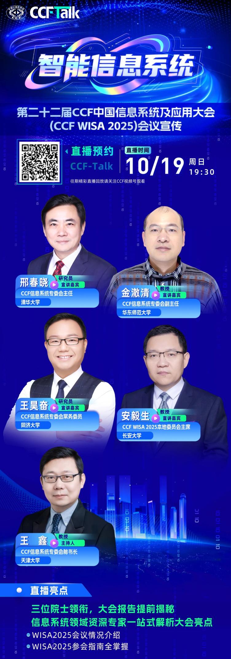 由中國計(jì)算機(jī)學(xué)會(huì)(CCF)主辦、CCF信息系統(tǒng)專業(yè)委員會(huì)、長安大學(xué)、西北大學(xué)共同承辦的旗艦會(huì)議——第二十二屆CCF中國信息系統(tǒng)及應(yīng)用大會(huì)(WISA 2025)(會(huì)議編號(hào):CCF-TC-24-141)將于2025年10月31日-11月2日陜西省西安市召開。