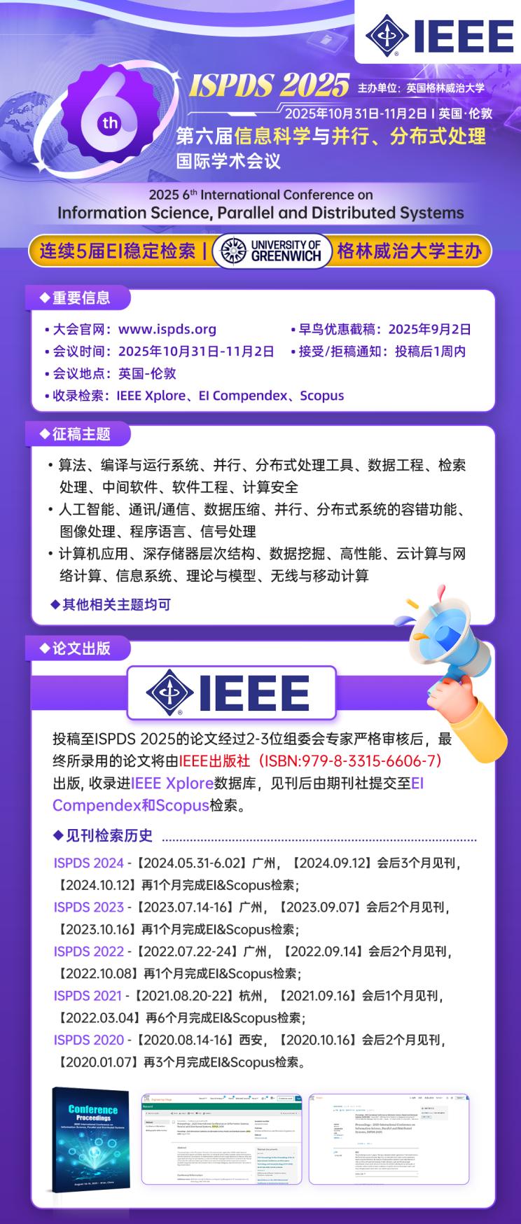 第六屆信息科學(xué)與并行、分布式處理國(guó)際學(xué)術(shù)會(huì)議(ISPDS 2025)定于2025年10月31日-11月2日在英國(guó)倫敦隆重舉行。會(huì)議旨在為從事信息科學(xué)、并行或分布式處理研究的專家學(xué)者、工程技術(shù)人員、技術(shù)研發(fā)人員提供一個(gè)共享科研成果和前沿技術(shù),了解學(xué)術(shù)發(fā)展趨勢(shì),拓寬研究思路,加強(qiáng)學(xué)術(shù)研究和探討,促進(jìn)學(xué)術(shù)成果產(chǎn)業(yè)化合作的平臺(tái)。大會(huì)誠(chéng)邀國(guó)內(nèi)外高校、科研機(jī)構(gòu)專家、學(xué)者,企業(yè)界人士及其他相關(guān)人員參會(huì)交流。