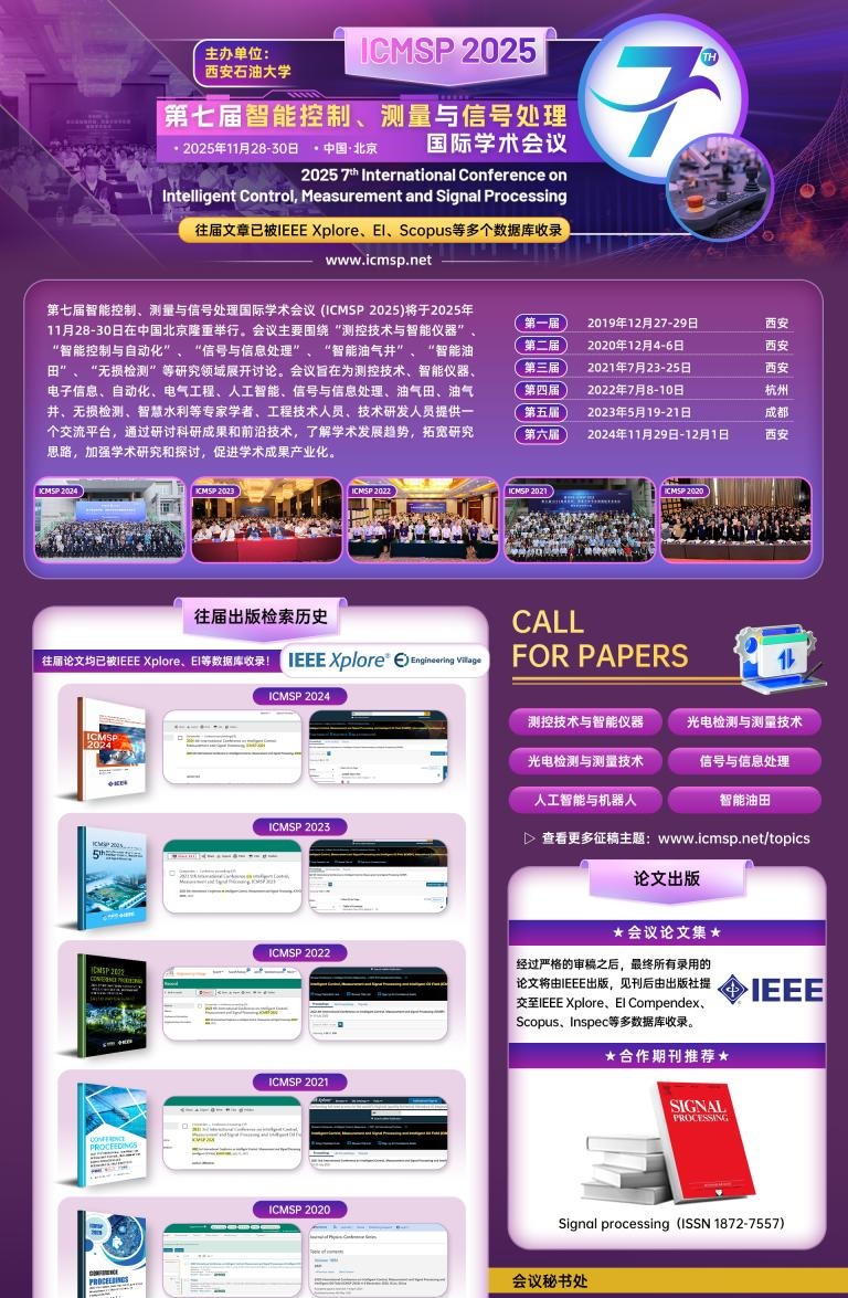 第七屆智能控制、測量與信號處理國際學(xué)術(shù)會議 (ICMSP 2025)將于2025年11月28-30日在中國西安隆重舉行。會議主要圍繞“測控技術(shù)與智能儀器”、“智能控制與自動化”、“信號與信息處理”、“智能油氣井”、“智能油田”、“無損檢測”等研究領(lǐng)域展開討論。會議旨在為測控技術(shù)、智能儀器、電子信息、自動化、電氣工程、人工智能、信號與信息處理、油氣田、油氣井、無損檢測、智慧水利等專家學(xué)者、工程技術(shù)人員、技術(shù)研發(fā)人員提供一個交流平臺,通過研討科研成果和前沿技術(shù),了解學(xué)術(shù)發(fā)展趨勢,拓寬研究思路,加強(qiáng)學(xué)術(shù)研究和探討,促進(jìn)學(xué)術(shù)成果產(chǎn)業(yè)化。
