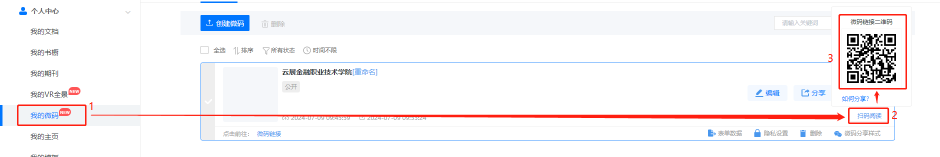 (1)點(diǎn)擊【我的微碼】,將鼠標(biāo)移動到對應(yīng)微碼的【掃碼閱讀】,便會出現(xiàn)二維碼。