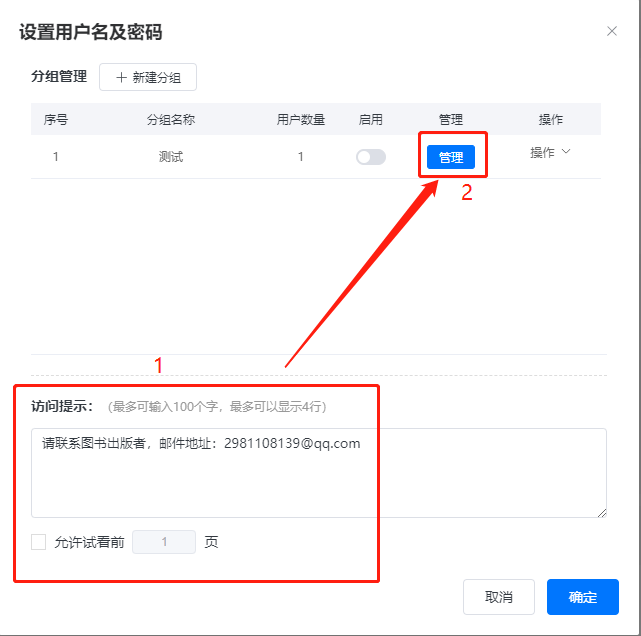 先在下方設(shè)置【訪問提示】以及允許查看前幾頁(yè),然后點(diǎn)擊【管理】。