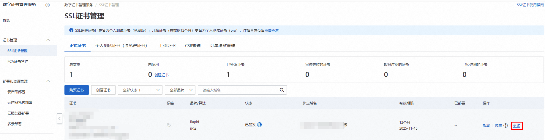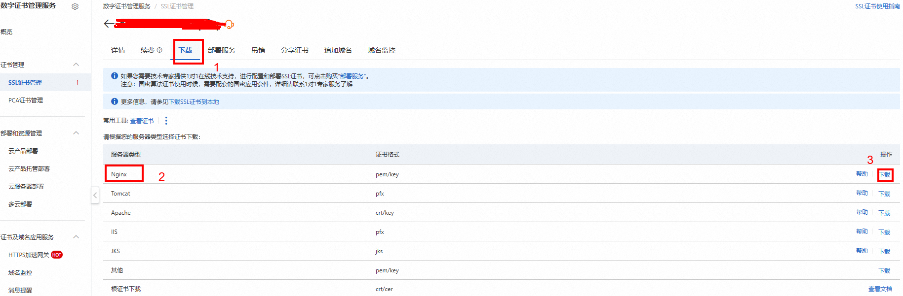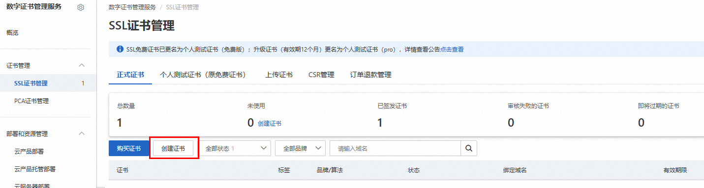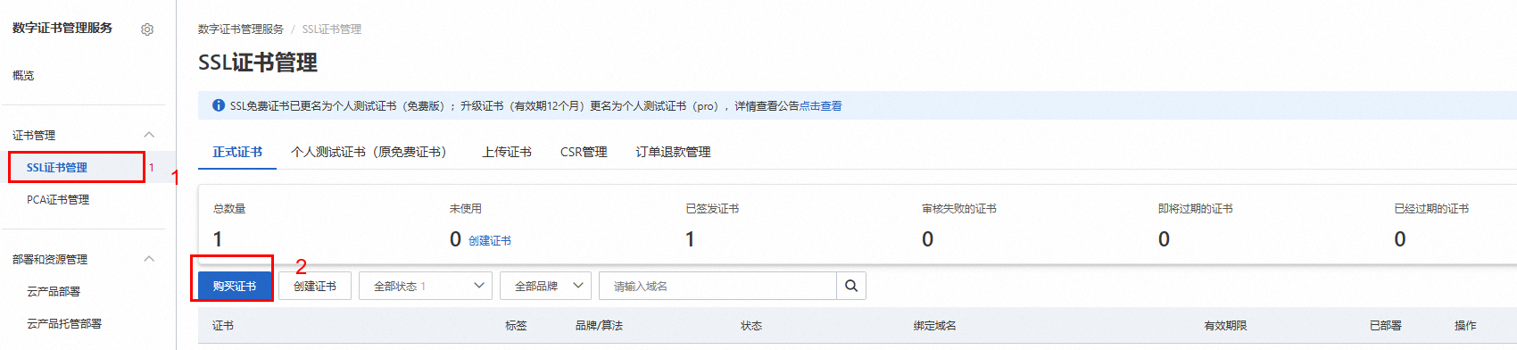 1)點(diǎn)擊左側(cè)欄的【SSL證書管理】,【購買證書】,如下圖: