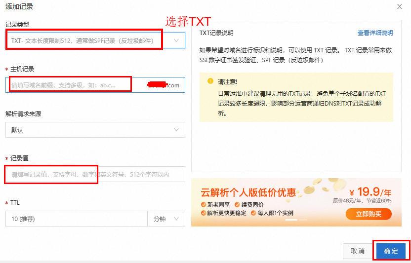 6)選擇TXT,并且填寫第二步復(fù)制的主機(jī)記錄以及記錄值,點(diǎn)擊【確定】