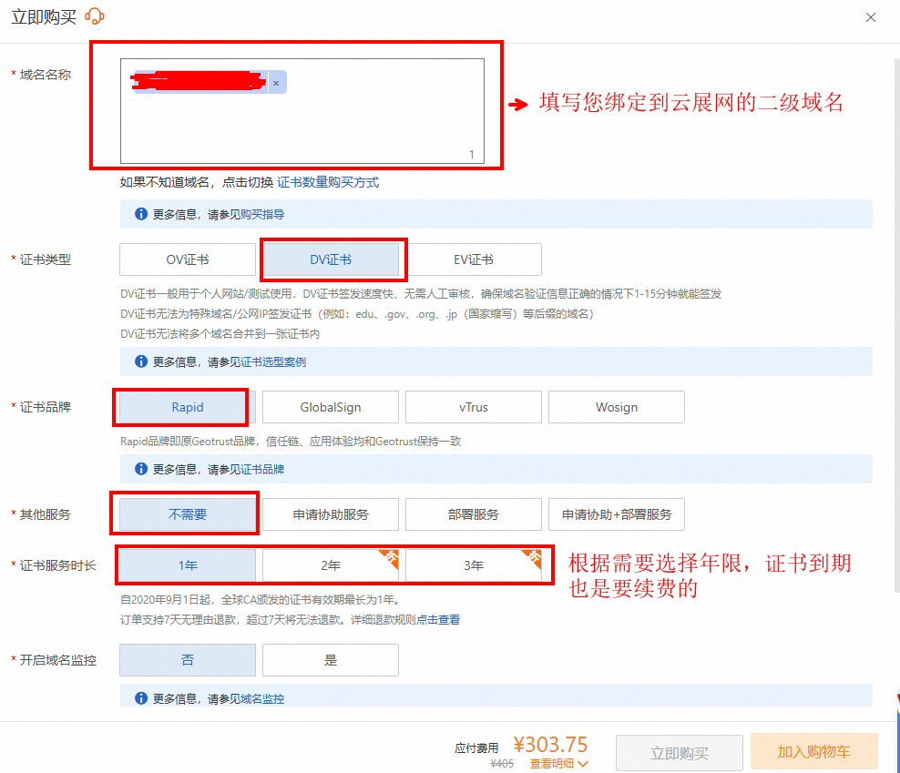 2)輸入二級(jí)域名,選擇DV證書,Rapid品牌等,加入購物車后。點(diǎn)擊立即購買付款