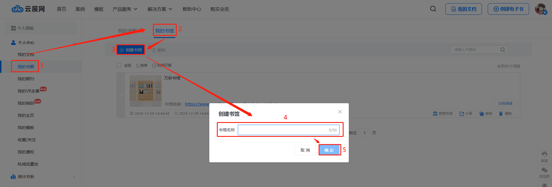 點擊【我的書櫥】,然后點擊【我的書館】,再點擊【創(chuàng)建書館】,輸入書館名稱,點擊確定。