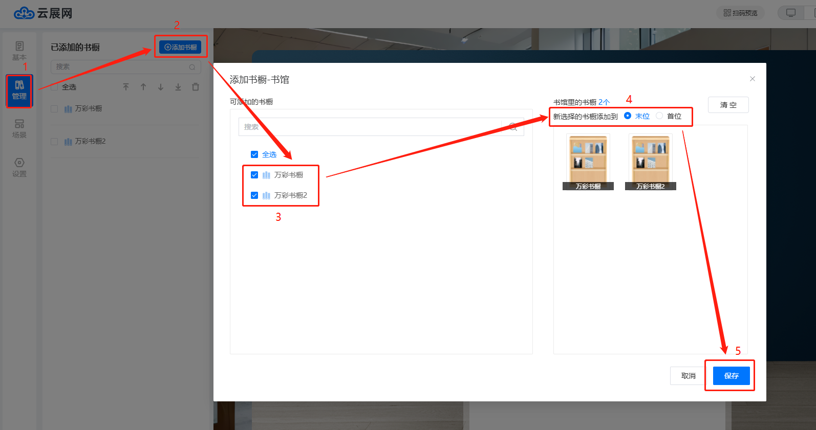 第一個步驟點擊確定之后,會直接跳轉(zhuǎn)到管理書櫥的界面,點擊【管理】,然后點擊【添加書櫥】,左側(cè)勾選需要添加的書櫥,右側(cè)選擇新選擇的書櫥添加的位置,點擊右下角保存。