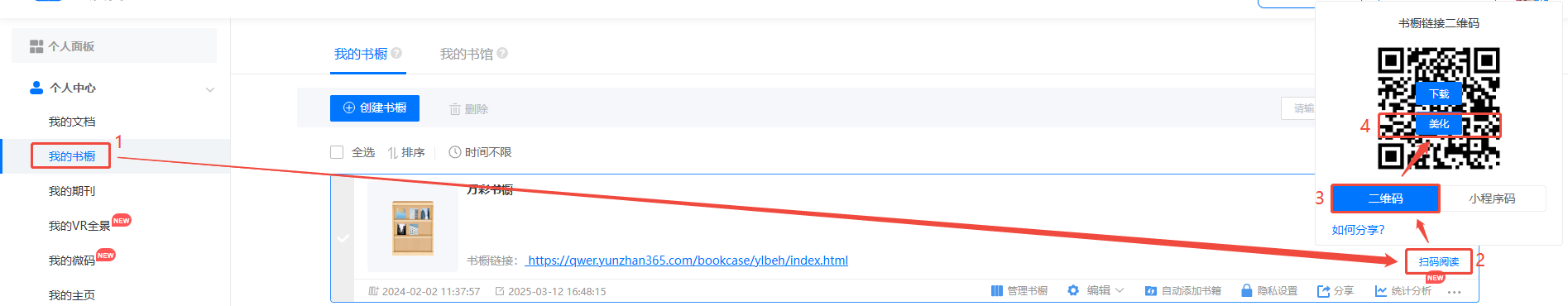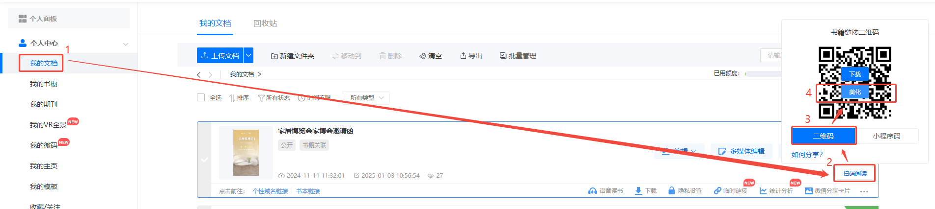 如果需要美化書本/書櫥的二維碼,點進【我的文檔】/【我的書櫥】,鼠標(biāo)移動到【掃碼閱讀】,選擇【二維碼】,鼠標(biāo)移動到二維碼上點擊【美化】。