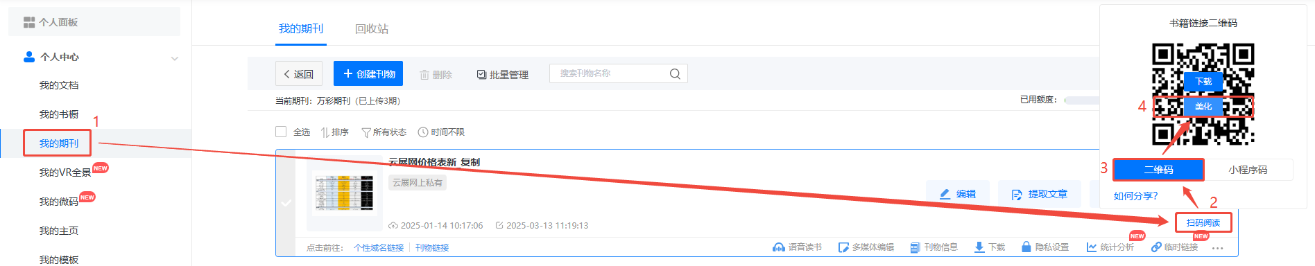 如果需要美化刊物的二維碼,點進【我的期刊】,打開期刊集,鼠標(biāo)移動到【掃碼閱讀】,選擇【二維碼】,鼠標(biāo)移動到二維碼上點擊【美化】。