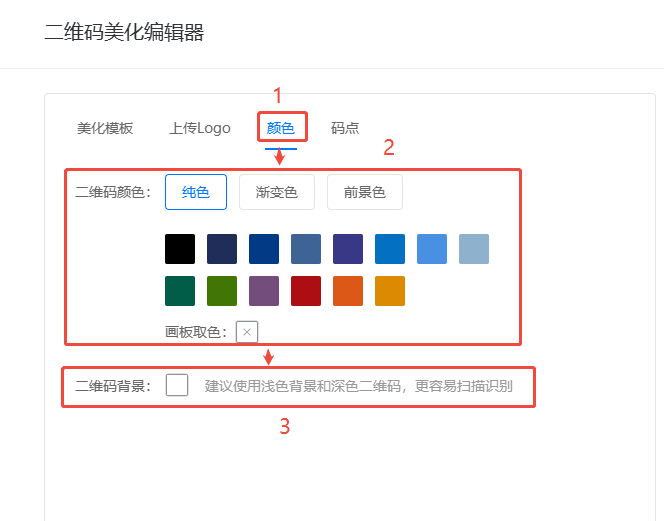 點擊【顏色】,下方設(shè)置二維碼顏色和二維碼背景色。
