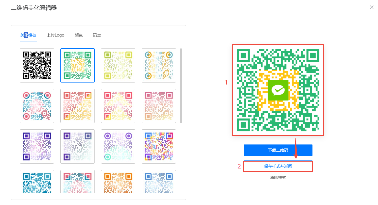 設(shè)置好之后在右側(cè)可預(yù)覽二維碼樣式,點擊【保存樣式并返回】即可保存。