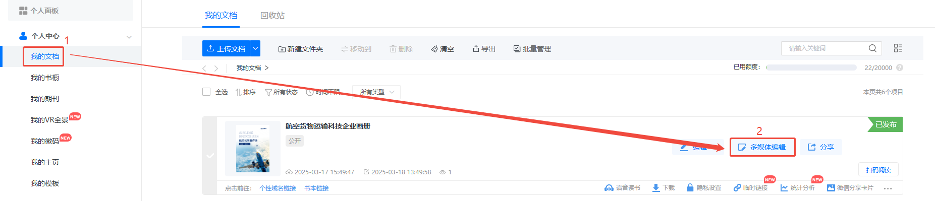 點(diǎn)進(jìn)【我的文檔】/【文檔】,選擇對應(yīng)電子書,點(diǎn)擊【多媒體編輯】/【內(nèi)容編輯】。
