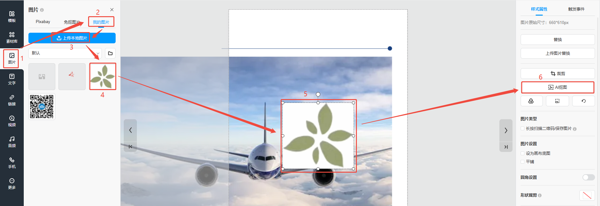 點(diǎn)擊【圖片】,再點(diǎn)擊【我的圖片】,然后點(diǎn)擊【上傳本地圖片】,將圖片上傳到下方素材庫中,點(diǎn)擊素材庫中的圖片,圖片會出現(xiàn)在頁面上,選中頁面上的圖片,最后點(diǎn)擊右側(cè)【AI摳圖】,打開AI摳圖界面。