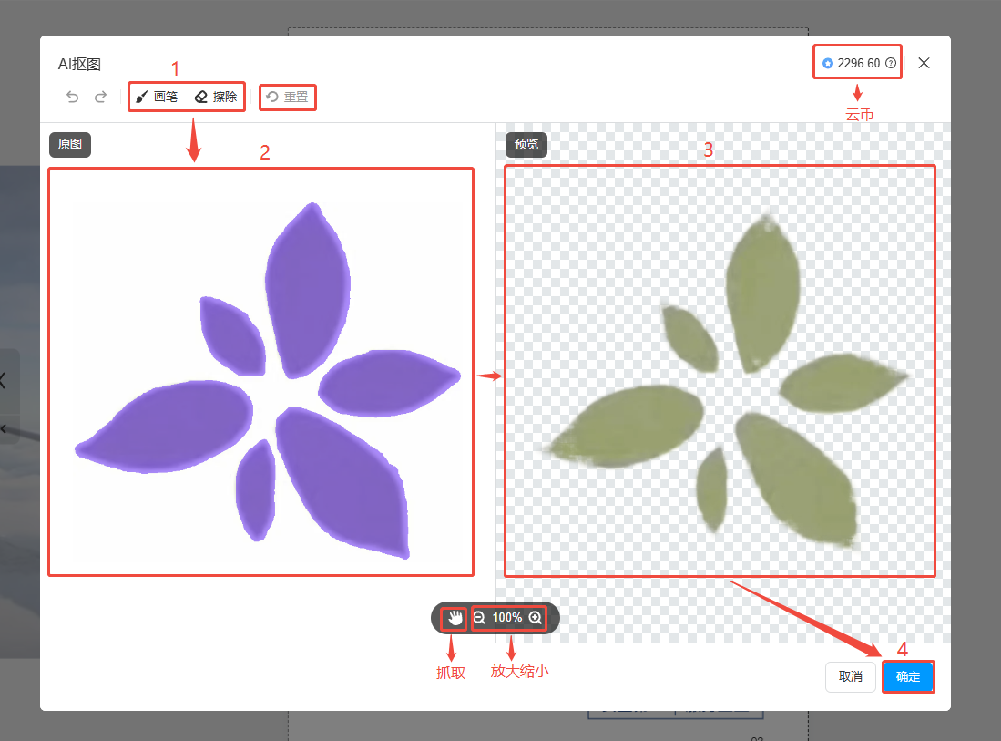 在左側(cè)原圖區(qū)域,紫色部分為摳出來的部分,可以用畫筆涂畫出想要摳出來的部分或者擦除不想摳出來的部分,右側(cè)預(yù)覽區(qū)域查看最終效果,點(diǎn)擊右下角確定。