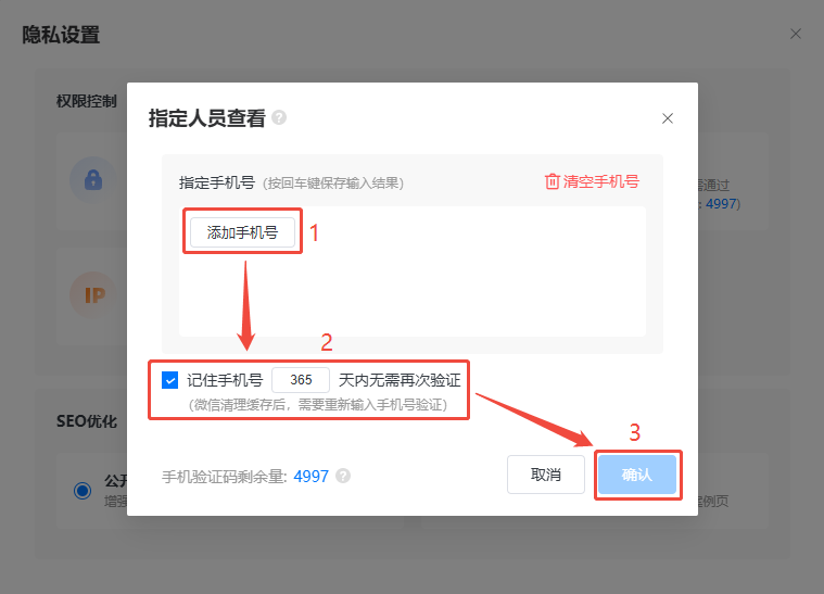 點(diǎn)擊【添加手機(jī)號(hào)】輸入一個(gè)或者多個(gè)手機(jī)號(hào),如果您希望讀者在設(shè)定的時(shí)間段內(nèi)再次訪問(wèn)時(shí)無(wú)需再驗(yàn)證,還可以選擇勾選下方的【記住密碼】,并設(shè)置間隔時(shí)間,最后點(diǎn)擊【確認(rèn)】。