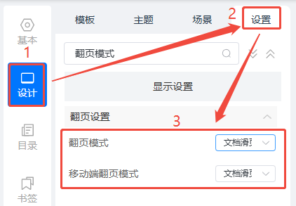 點(diǎn)擊【設(shè)計(jì)】,然后點(diǎn)擊【設(shè)置】,將【翻頁(yè)模式】和【移動(dòng)端翻頁(yè)模式】改成文檔翻頁(yè)。