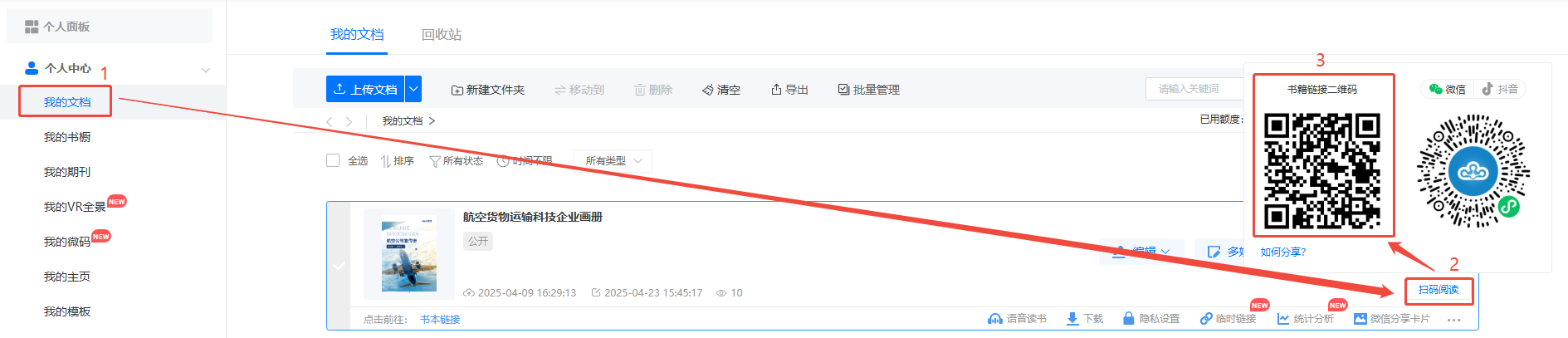 在【我的文檔】頁(yè)面,點(diǎn)擊【掃碼閱讀】,找到書(shū)籍鏈接二維碼。