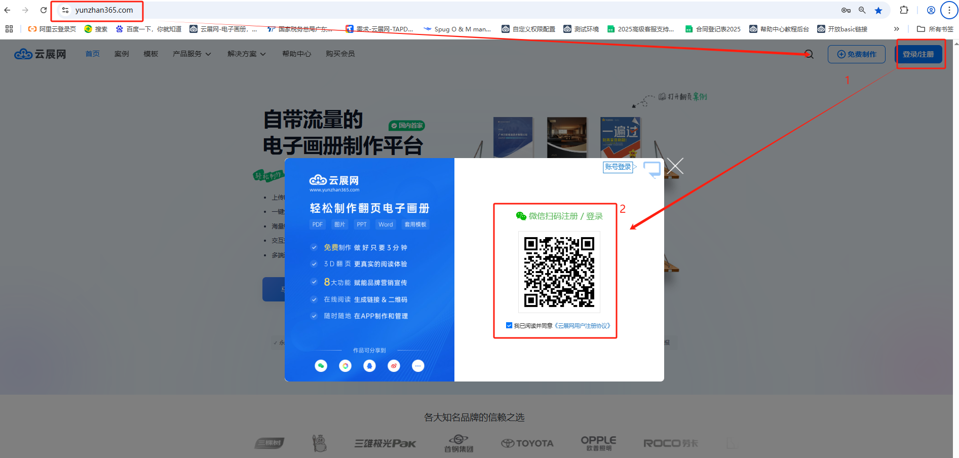 在電腦上打開瀏覽器,輸入網(wǎng)址http://www.1061937.com/打開云展網(wǎng),然后點(diǎn)擊右上角的【登錄/注冊(cè)】按鈕,用微信掃描二維碼登錄