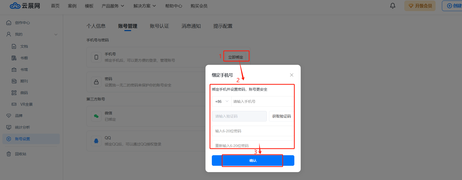 點(diǎn)擊【立即綁定】按鈕,輸入手機(jī)號(hào)、驗(yàn)證碼、密碼,然后點(diǎn)擊【確認(rèn)】,即可完成手機(jī)號(hào)綁定