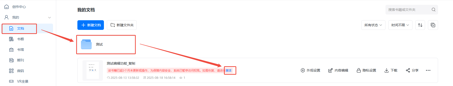 為進一步保障內容安全,免費用戶的書籍若連續(xù)三個月內無任何編輯、修改等更新操作,或者付費會員會員資格到期滿三個月起,系統將對書籍進行暫時停止訪問處理,用戶登錄賬戶并完成激活操作后,可立即恢復書籍的正常訪問權限。