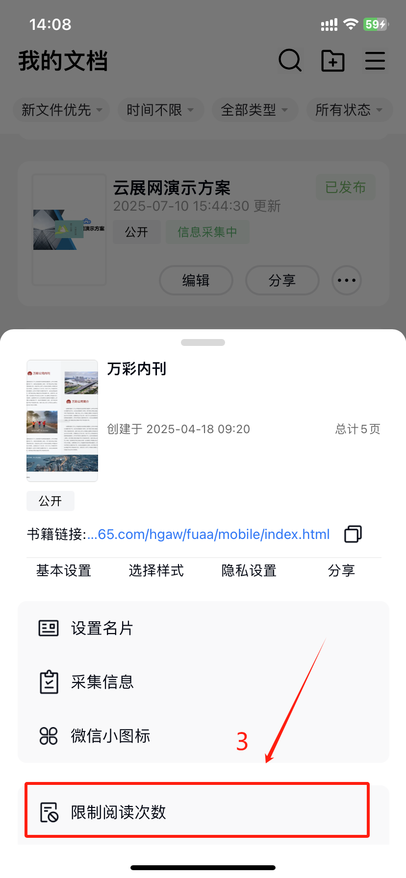 在【作品】頁面,點(diǎn)擊三個點(diǎn)【…】按鈕打開,找到【限制閱讀次數(shù)】點(diǎn)擊