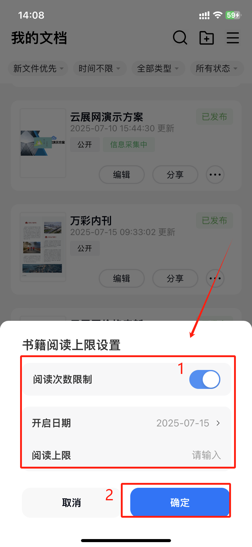 開啟【閱讀次數(shù)限制】,設(shè)置【開啟日期】以及設(shè)置【閱讀上限】次數(shù),設(shè)置好后,點(diǎn)擊【確定】