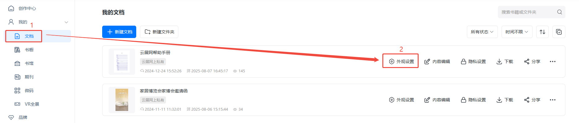 點(diǎn)擊【文檔】,找到對(duì)應(yīng)電子書(shū),點(diǎn)擊【外觀設(shè)置】。