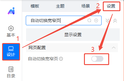 點(diǎn)擊【設(shè)計(jì)】,然后點(diǎn)擊【設(shè)置】,打開(kāi)【自動(dòng)切換寬窄頁(yè)】。