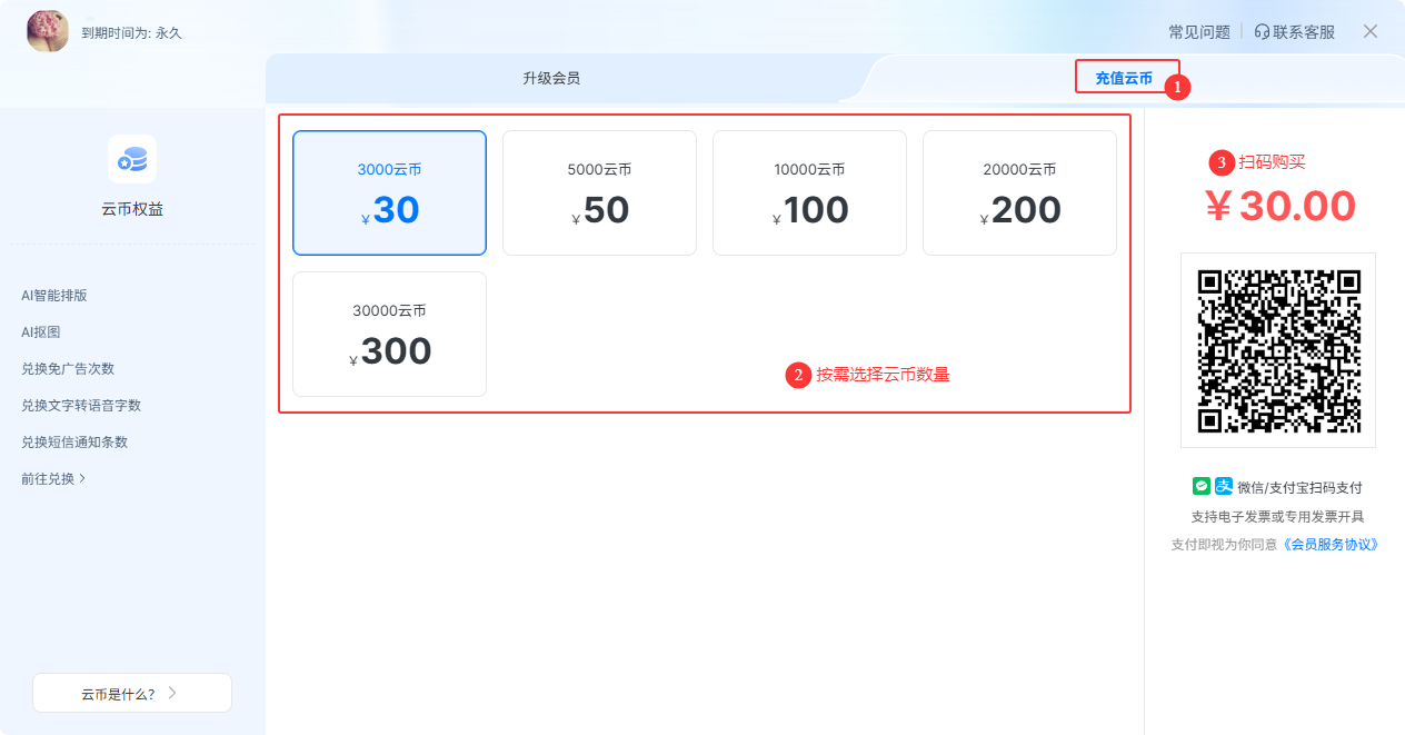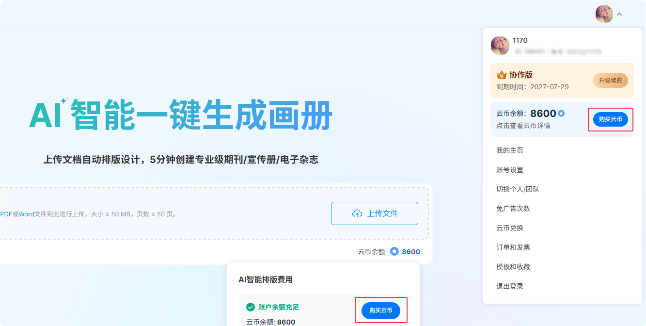 點(diǎn)擊右上角的頭像,或者在【上傳文件】按鈕下方, 鼠標(biāo)懸浮在云幣數(shù)值上,均可查看當(dāng)前賬號剩余云幣或點(diǎn)擊【購買云幣】,根據(jù)自身需要選擇購買更多云幣。