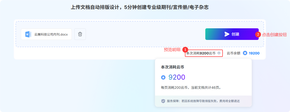 2.? 文檔上傳成功后,,用戶瀏覽確認(rèn)計(jì)費(fèi)明細(xì),點(diǎn)擊【創(chuàng)建】按鈕,即扣除云幣,此操作不可撤銷。