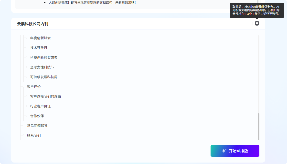 ① 開始AI排版之前,若需重新上傳文檔,可點(diǎn)擊右上角【取消】按鈕終止當(dāng)前流程,預(yù)扣云幣將在 1-3 個工作日內(nèi)自動返還至賬戶。