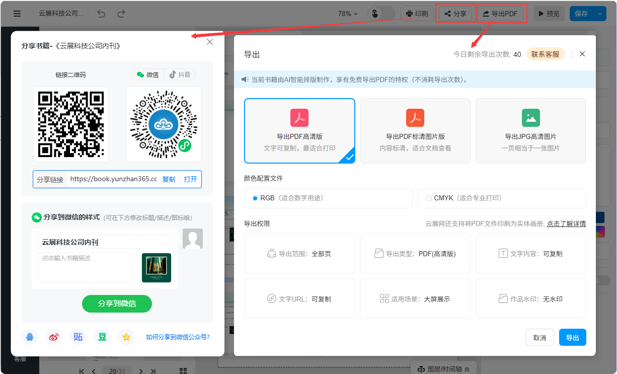 制作完成后, 可在線分享書籍或?qū)С龈咔錚DF。