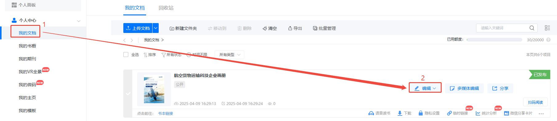 點(diǎn)擊【我的文檔】,選擇需要設(shè)置的電子畫冊,點(diǎn)擊【編輯】。