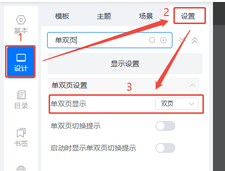 點(diǎn)擊【設(shè)計(jì)】,然后點(diǎn)擊【設(shè)置】,把【單雙頁顯示】改為雙頁即可。