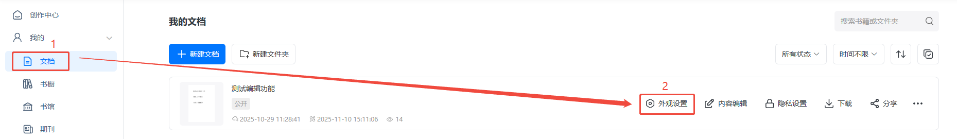 在【文檔】頁面,找到對應(yīng)電子畫冊,點擊【外觀設(shè)置】。