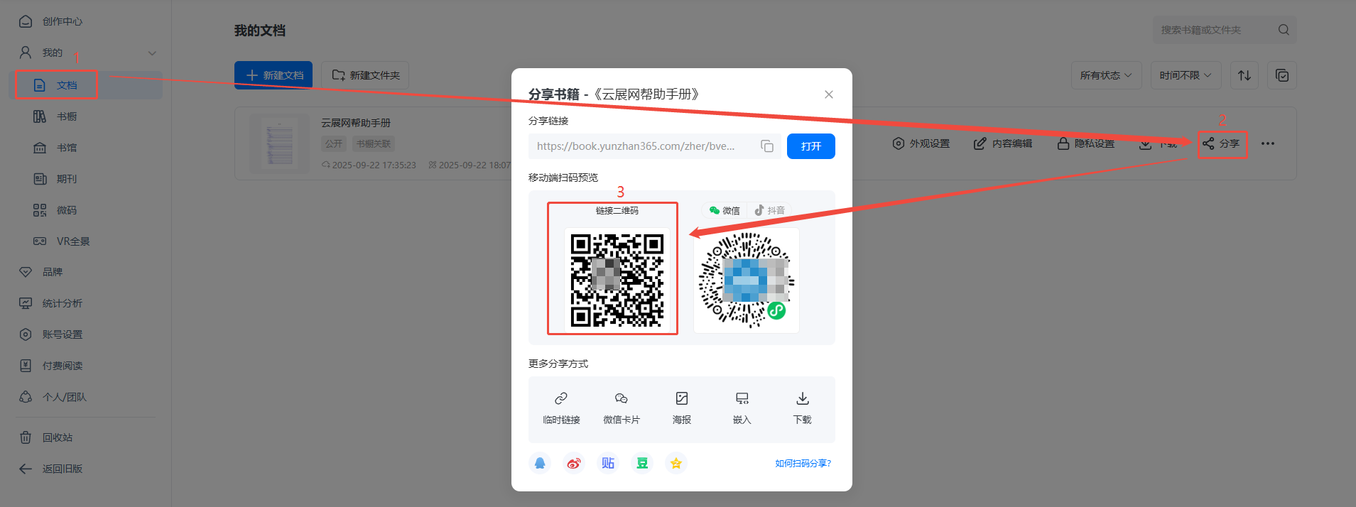在【文檔】頁面,點(diǎn)擊【分享】,找到鏈接二維碼。