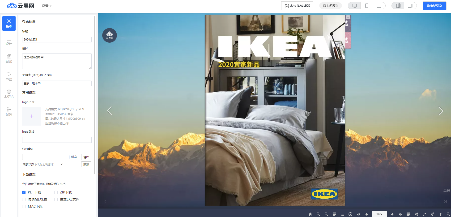 管理、修改電子雜志設(shè)置 創(chuàng)建雜志上傳審核完畢之后,需要更改雜志設(shè)置,可以在登陸賬號(hào)后,鼠標(biāo)放在云展網(wǎng)右上角的頭像處,點(diǎn)擊“我的文檔”,就能見到自己上傳的書本了。 下面請(qǐng)看下紅框中的編輯按鈕,就是用于修改書本配置的: 編輯雜志:上傳好的雜志可以通過編輯雜志更改各項(xiàng)功能,同步預(yù)覽各種設(shè)置,更改雜志下載格式以及切割功能。具體功能請(qǐng)看編輯雜志功能介紹。