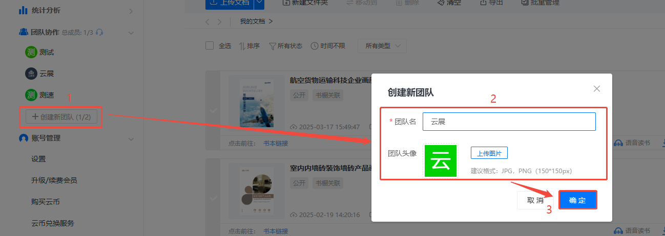 點擊【創(chuàng)建新團隊】,輸入團隊名以及上傳團隊頭像后點擊【確定】,即為創(chuàng)建成功。