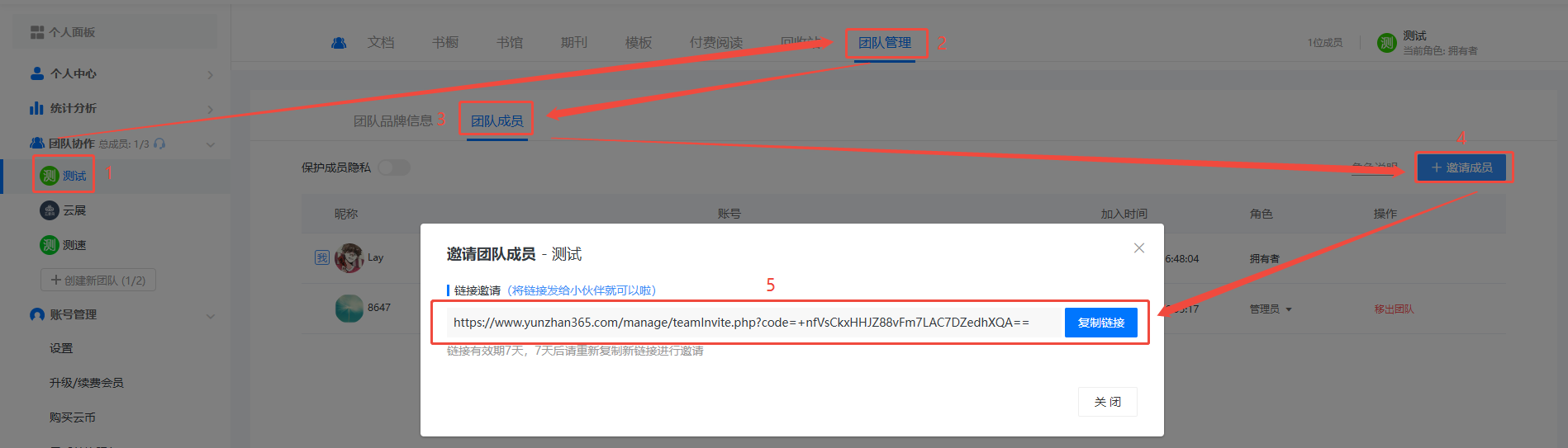 點進創(chuàng)建的團隊,點擊【團隊管理】,然后點擊【團隊成員】,再點擊【邀請成員】,會有一個邀請鏈接,復(fù)制后發(fā)給好友,好友點擊鏈接進去即可申請加入團隊。
