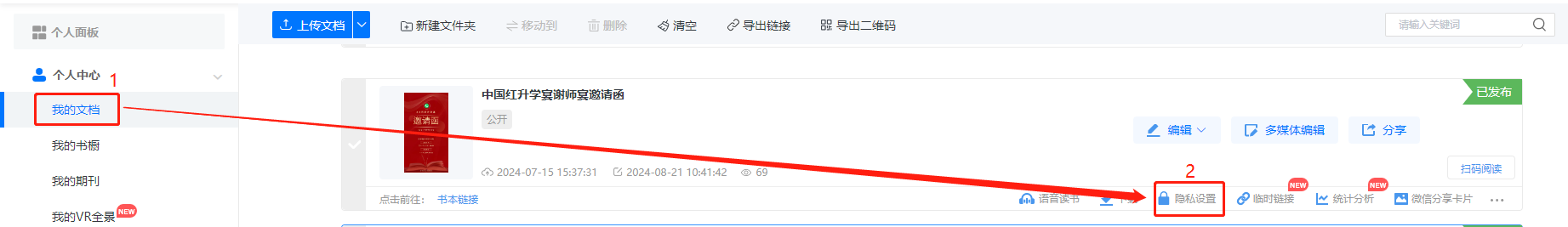 在【我的文檔】里找到要設(shè)置的電子雜志,點(diǎn)擊【隱私設(shè)置】。