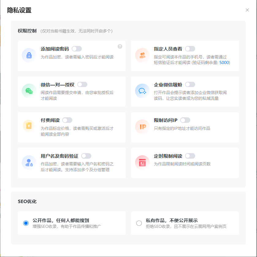 電子雜志隱私設(shè)置有10種:添加閱讀密碼、指定人員查看、企業(yè)微信吸粉、微信一對一授權(quán)閱讀、付費(fèi)閱讀、限制訪問IP、用戶名及密碼驗(yàn)證、定時限制閱讀、在云展網(wǎng)上私有、網(wǎng)站上公開。