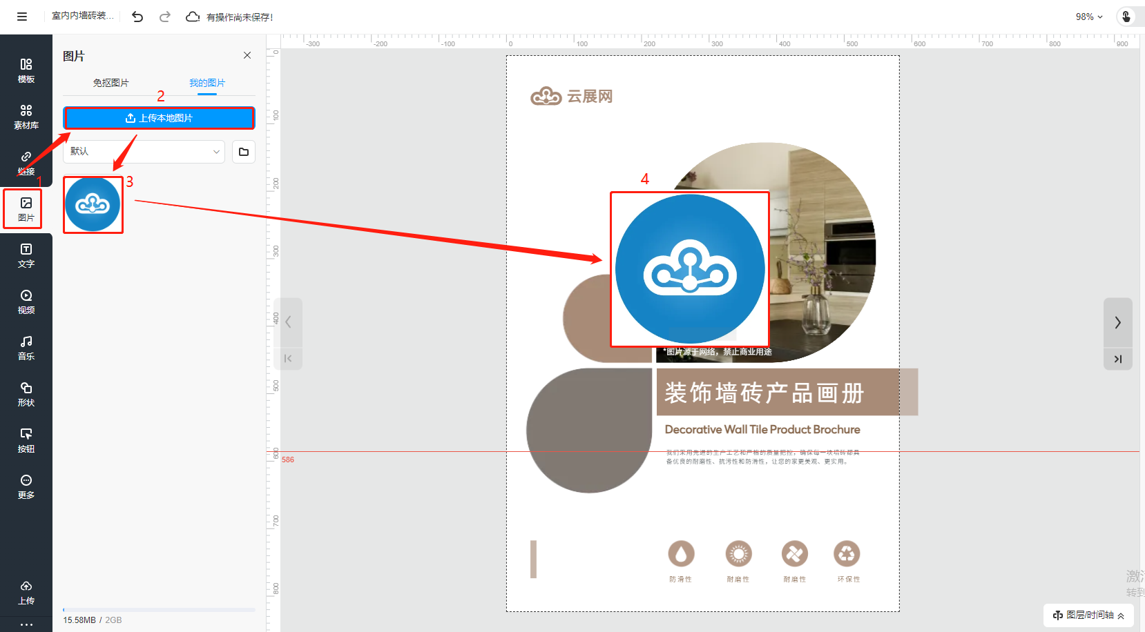 選擇【圖片】進(jìn)入圖片界面,點(diǎn)擊【上傳本地圖片】,選擇電腦上的圖片進(jìn)行上傳,上傳成功的圖片會(huì)出現(xiàn)在下方圖片欄,再次點(diǎn)擊一下圖片,圖片會(huì)直接出現(xiàn)在頁(yè)面上,點(diǎn)擊拖動(dòng)可以調(diào)整位置,也可以調(diào)整大小。