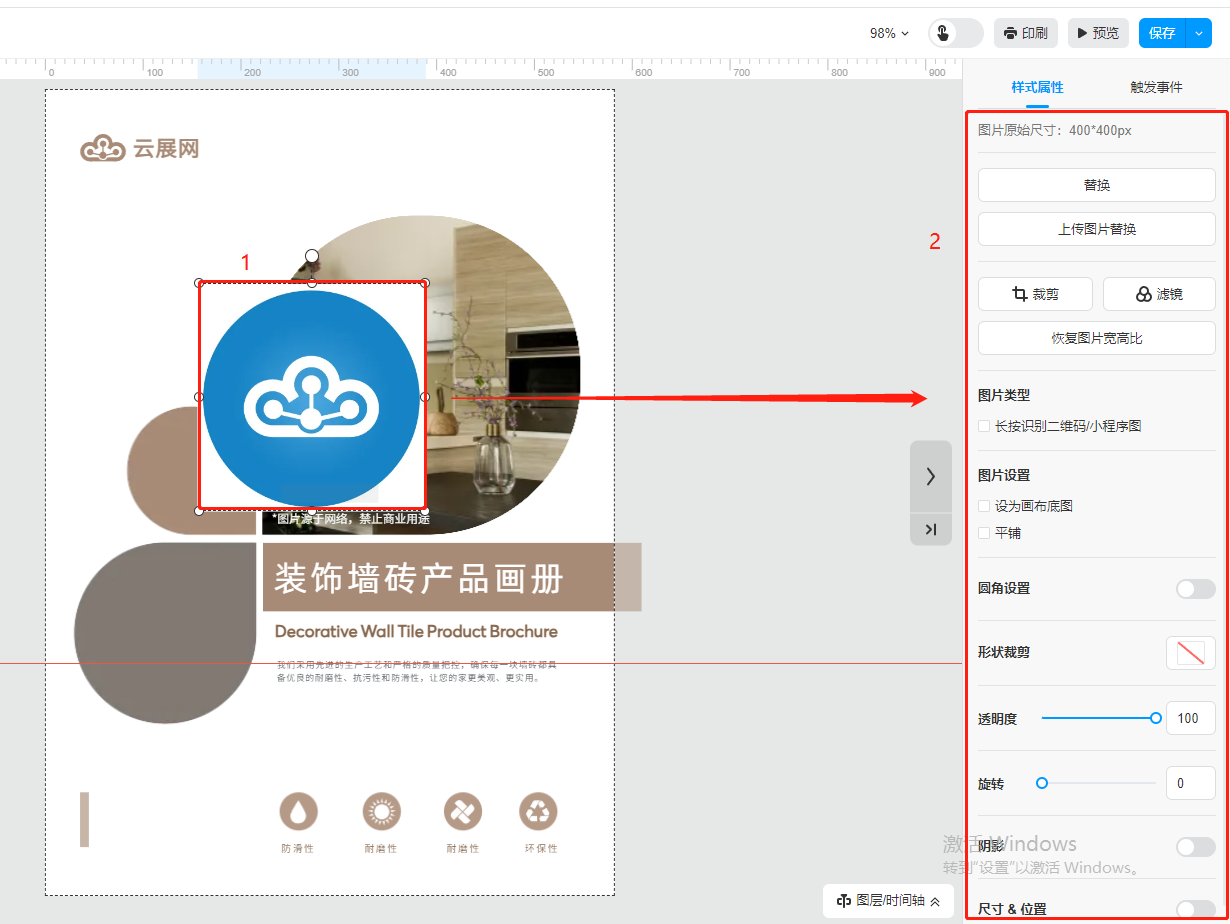 點(diǎn)擊頁(yè)面上的圖片,在右側(cè)設(shè)置樣式屬性。
