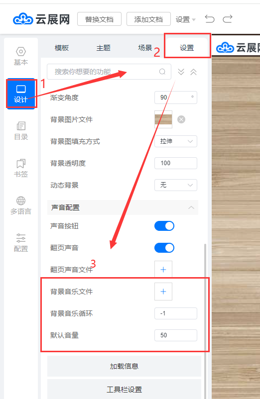 點擊【設(shè)計】,點擊【設(shè)置】,查找【聲音配置】,選擇上傳背景音樂文件。