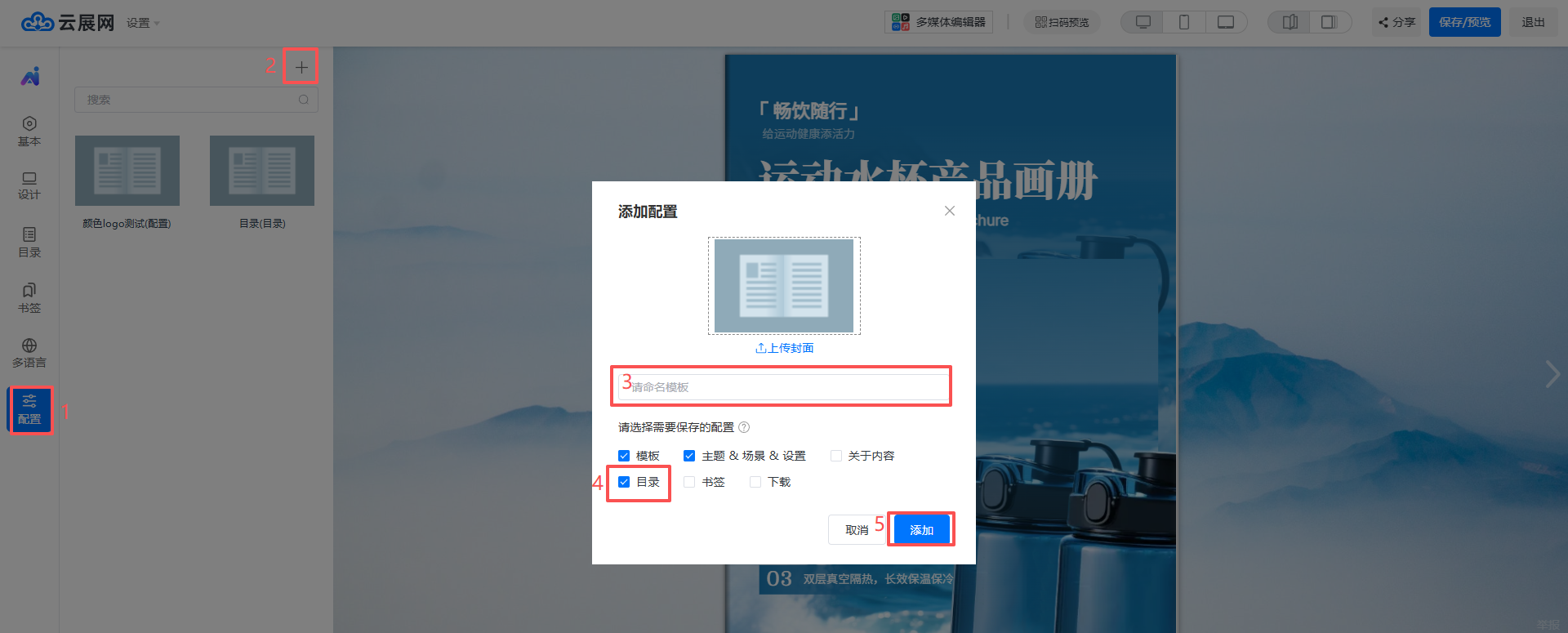 選擇【目錄】,點擊【+】按鈕,即可設(shè)置標題,頁碼。添加好所有目錄后點擊保存預(yù)覽。