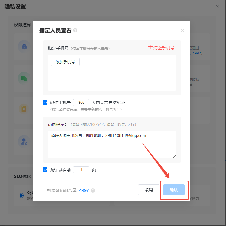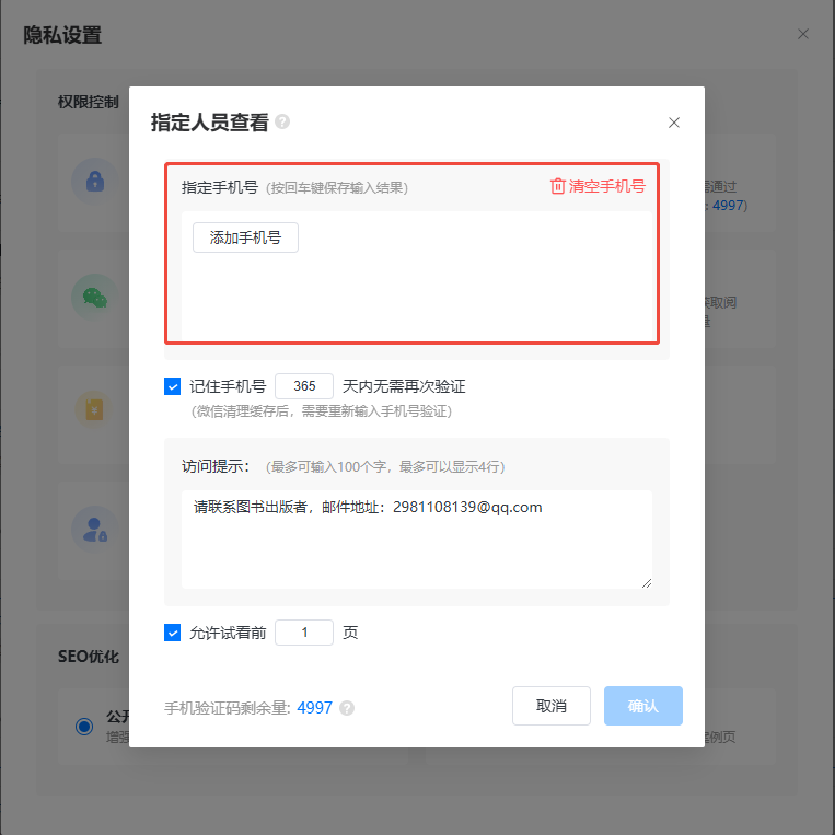 如果你想允許讀者看幾頁之后再要求輸入手機(jī)號驗(yàn)證,可設(shè)置一下允許查看幾頁。