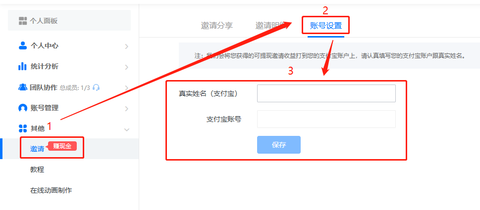 點(diǎn)擊【邀請】,然后點(diǎn)擊【賬號設(shè)置】,下方填寫支付寶真實(shí)姓名和支付寶賬號,并保存。